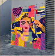 An architectural engineer by trade, and a creative artist by passion, Noor is known for her playful, witty illustrations which seamlessly blend structure with engaging storytelling. Her art captures everyday Emirati life through humour and a distinct modern edge. Noor's contribution to the destination is the ‘The Spirit Within', a mural inspired by her rich Emirati heritage and diverse energies that define the UAE today. Her quirky signature style is complemented in the striking piece by her use of vibrant colours and playful imagery. The mural is highlighted by the image of an Emirati woman wearing colourful clothing and surrounded by national symbols and rhythmic placement of abstract elements, symbolising the coexistence of heritage and innovation.